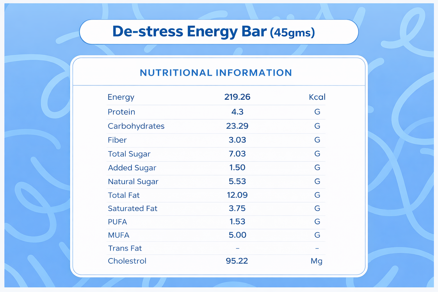 De-stress Functional Bar crafted with natural ingredients - Dark Chocolate, Almonds, Cashews, Bajra Puffs, Cranberries and Watermelon Seeds.